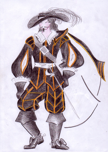 George Villiers, vévoda z Buckinghamu, ministr krále Karla I. Přijel r.1625 do Paříže, aby dohodl podmínky sňatku mezi svým králem a francouzskou princeznou. Setkal se v Paříži s mladičkou Annou Rakouskou královnou Francie a Navarry. Během svatebního průvodu na hranice Francie se sblížili a jejich tajný milostný příběh se stal předlohou slavného románu. Rané baroko milovalo samet, brokát a bílé krajky. Muži šlechtického stavu byli velmi elegantní a dvorní. Kostým byl zhotoven pro Milana Straku. Přejeme hodně úspěchů!