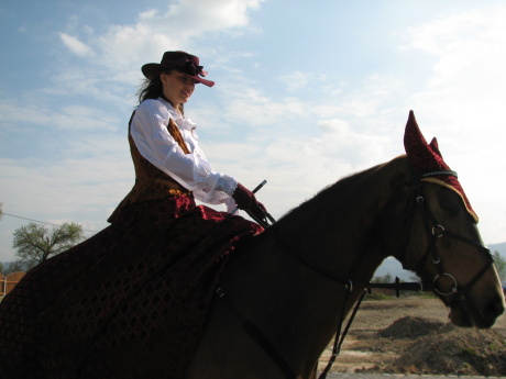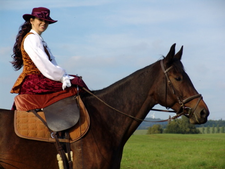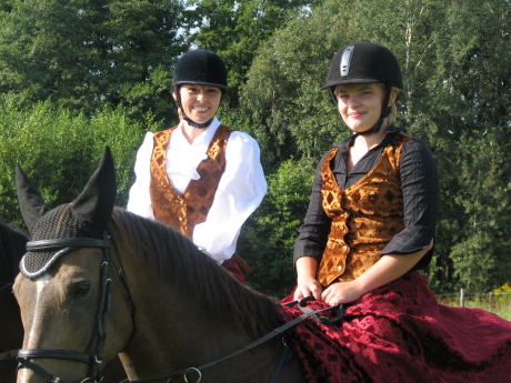 Později byl kostým zdvojen a doplněn jezdeckou helmou. Lenka a Míša si v něm vyjely na středověkou tvrz na společenskou akci.