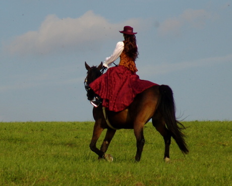 Byl navržen pro odpolední vyjížďku dámy v dámském sedle. Kostým se skládá ze sametové sukně sportovní délky, která může být jak rozprostřena na hřbetě koně, tak spuštěna na pravé straně. Oslnivě bílá halenka s fiží je ozdobena vzdušnou krajkou na volánových koncích rukávů a překrývá ji sametová vesta vzadu se šůskem ve zlatavé barvě. Kostým je doplněn originální secesní broží na fiží. Ženskost tohoto modelu dotváří klobouk se saténovou mašlí, barevně sladěný se sukní a rukavice téže barvy.